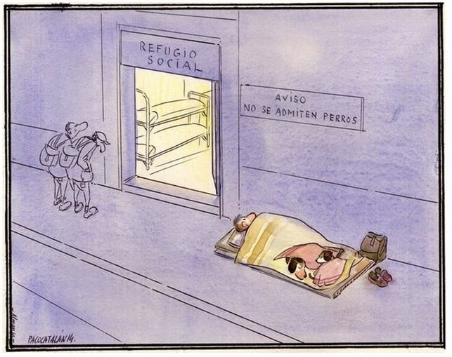 La administración no entendió entonces, y sigue sin entenderlo ahora, que al obligarle a a abandonar a lo único hacia lo que siente arraigo se estaba cerrando la puerta a su recuperación. Decisiones administrativas desprovistas de cualquier tipo de humanidad, realizadas con rigidez y sobre todo con escasa eficacia. Lo que entre otras cosas significa que los contribuyentes estamos pagando por un servicio que se realiza en muchos casos sin tener en cuenta que la sociedad está cambiando y con ella su relación con los animales. Conviene recordar lo que dice la organización Pets of homeless (organización de voluntarios que provee alimentos para animales y atención veterinaria para las personas sin hogar en Estados Unidos y Canadá) después de estudiar la situación de cientos de personas: "Los animales de los sin techo son un enlace a la realidad, por eso y por el vínculo y amor que se establece son capaces de sacrificarse para proteger a su animal". Obligar a los sin techo a desprenderse de sus animales puede empeorar aún más su vida. Sin embargo, adaptar los centros para que puedan acceder con ellos ayuda en su recuperación, en su rehabilitación o simplemente les facilita el tránsito de una ciudad a otra evitando empeorar más aún la situación.