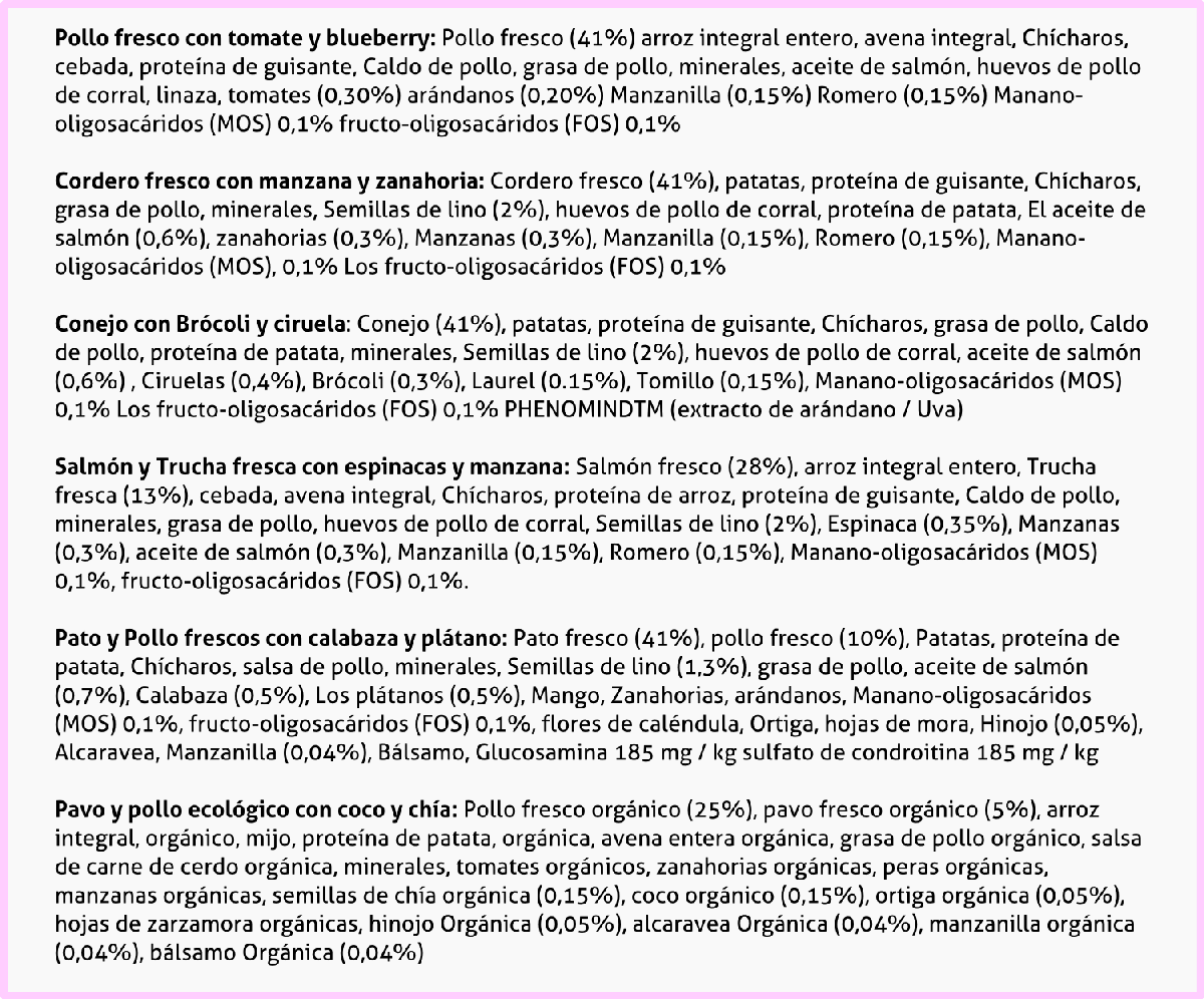 Salvo en la variedad ecológica, en el resto encontramos en torno a un 41% de carne o pescado fresco y también incorporan aceite de salmón, que ayuda a nuestros perros a mantener una piel y un pelo sanos y brillantes. Cada una de ellas añade unos ingredientes diferenciadores como romero, manzanilla, chicharros o huevo de pollo de corral, que hace cada receta única.