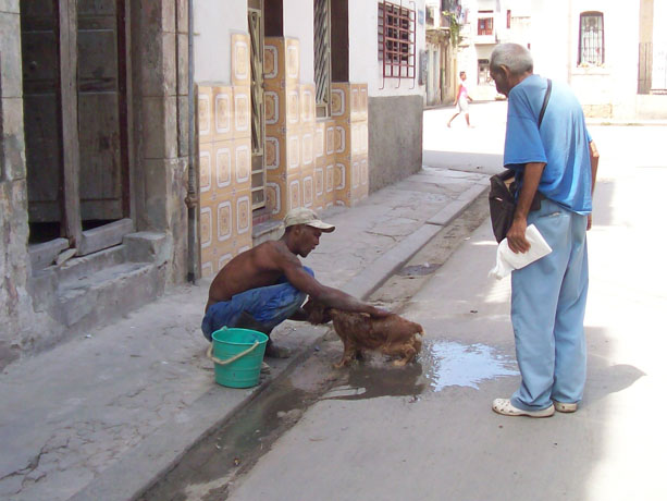 “No se puede hacer nada efectivo desde las sociedades protectoras, que no te creas por el nombre que son muy grandes, se puede decir que funcionan desde nuestras propias casas. […] A veces hacemos campañas de vacunación o de esterilización pero todo eso con nuestros recursos. […] El gobierno funciona muy coherente con su política de siempre”, nos dice Oneibis Lanusa, técnico veterinario que ejerce en una clínica privada de Centro Habana: “Si no se preocupa por darle de comer a la gente, ¿por qué lo va a hacer por los perros callejeros? […] La gente abandona a los animales porque son bocas a las que hay que dar comida y la cosa está mala. Atender un perro cuesta. Una vacuna como la sextavalente son 10 dólares, ya eso te lleva el salario de un mes; después viene la desparasitación, los problemas de ácaros en la piel, las epidemias de moquillo, y si alimentas mal al animalito se te acumulan más y más problemas y la mascota se vuelve una renta. La gente termina deshaciéndose del perro o el gato porque mantenerlos sanos es un lujo en un país donde hay tanta miseria. […] El gobierno solo se dedica a recogerlos para matarlos pero esa no es la solución, tampoco se hace mucho con las campañas publicitarias porque, como te digo, el problema es la miseria, y eso por ahora no tiene remedio”.