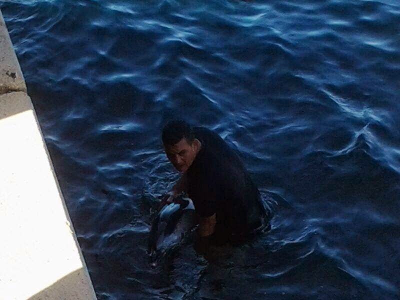 Viernes 25 de abril de 2014.- Al parecer el animal, de unos 100 o 120 cm de longitud, nadaba con dificultad en la orilla, por lo que al percatarse de su presencia varias personas se preocuparon por su estado de salud.