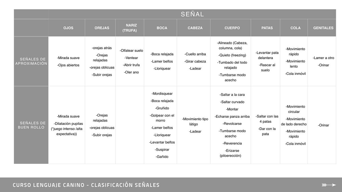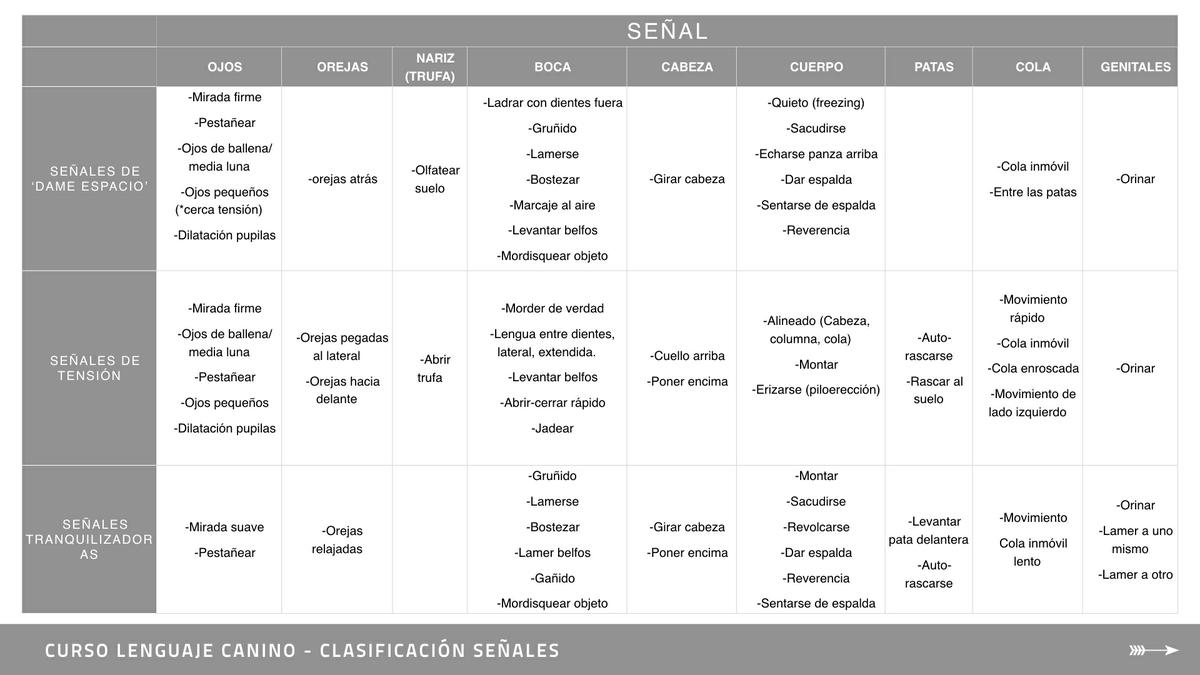 Te adjunto la tabla para que te hagas una idea, y te familiarices con todas ellas. Si quieres descargarte la presentación con las señales, puedes hacerlo en el curso gratuito Introducción al lenguaje canino.