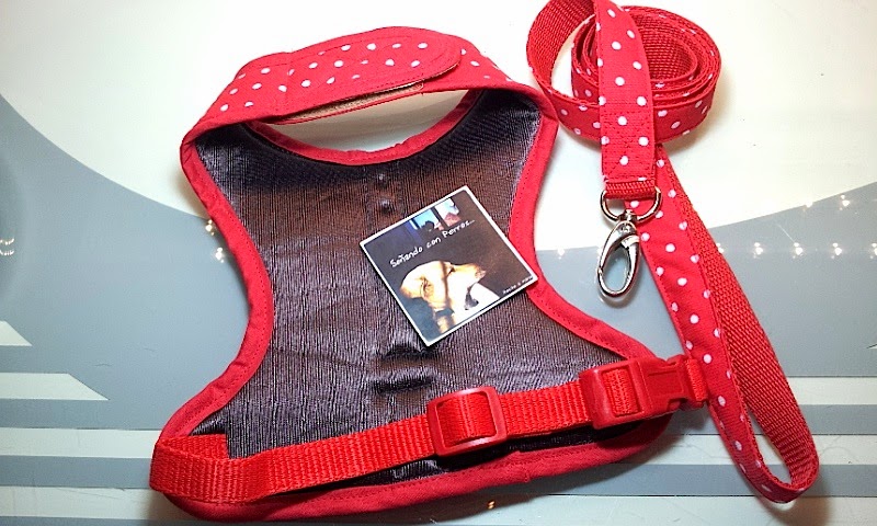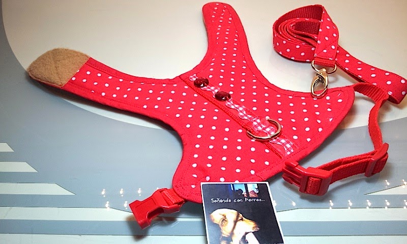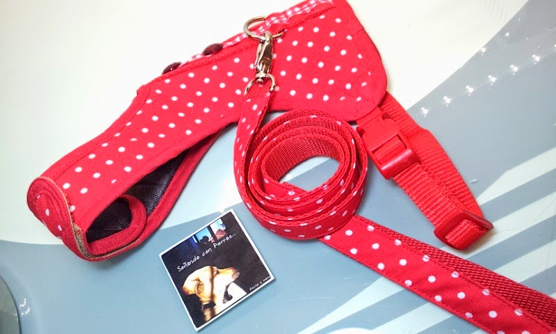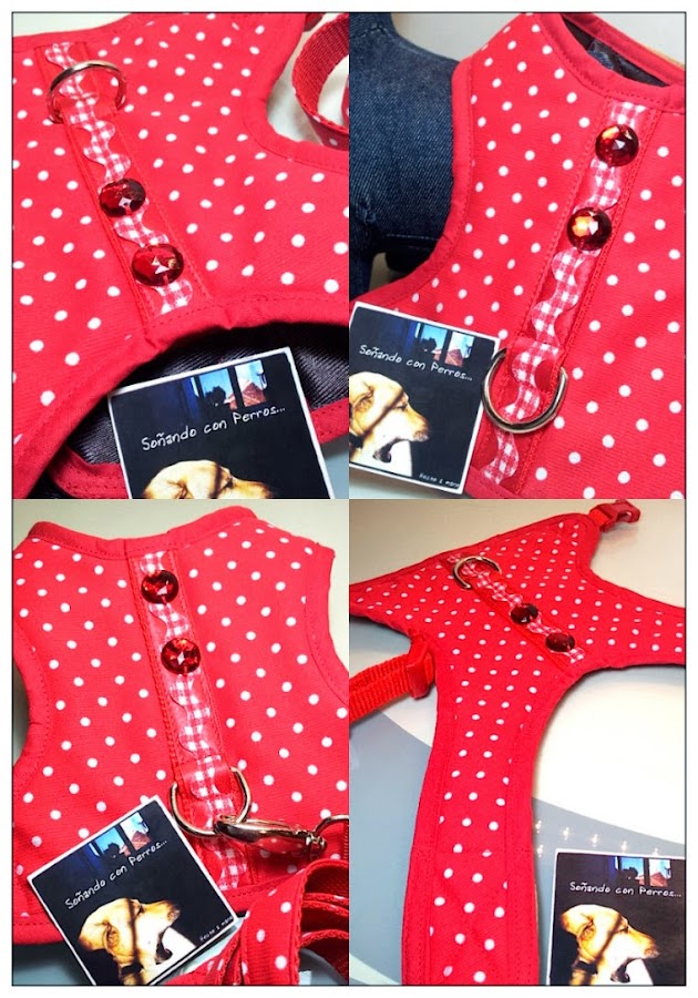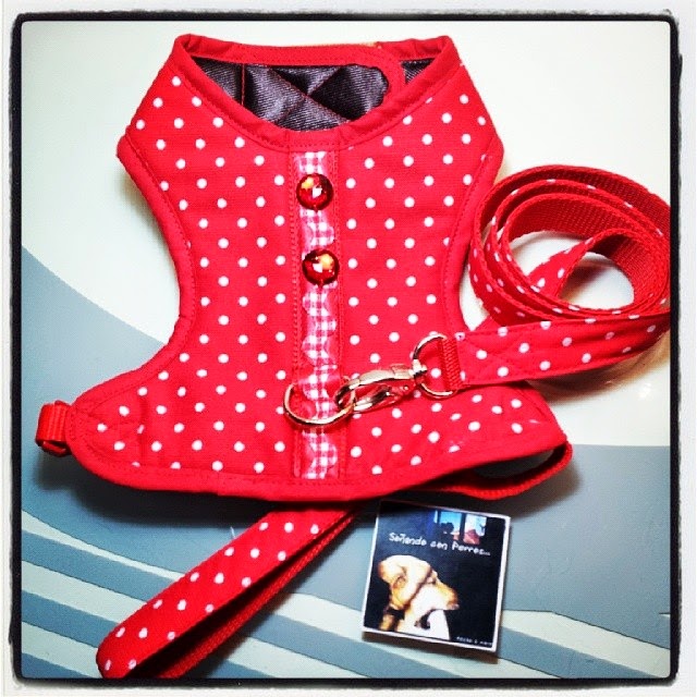 Este arnés va destinado para un pequeño bichón maltés blanquito, con lo que el arnés en ese rojo pasión con los topos en blanco le va a quedar perfecto...