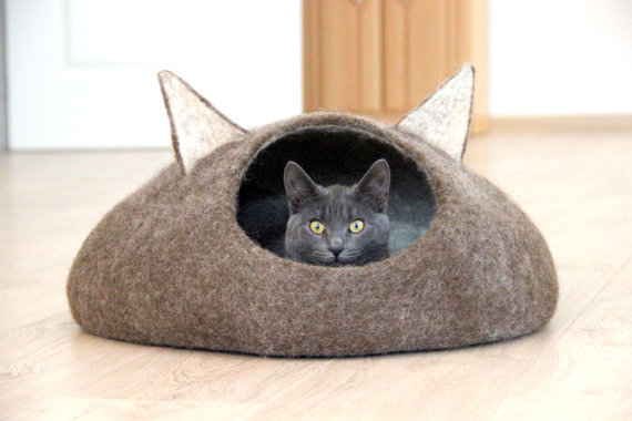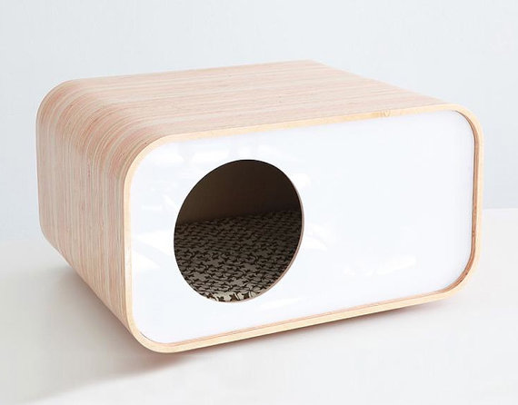 Modernmews en Etsy ofrece algunas gato-cosas con diseños originales, como esta casita para que tu gato se resguarde, con un diseño ultramoderno: