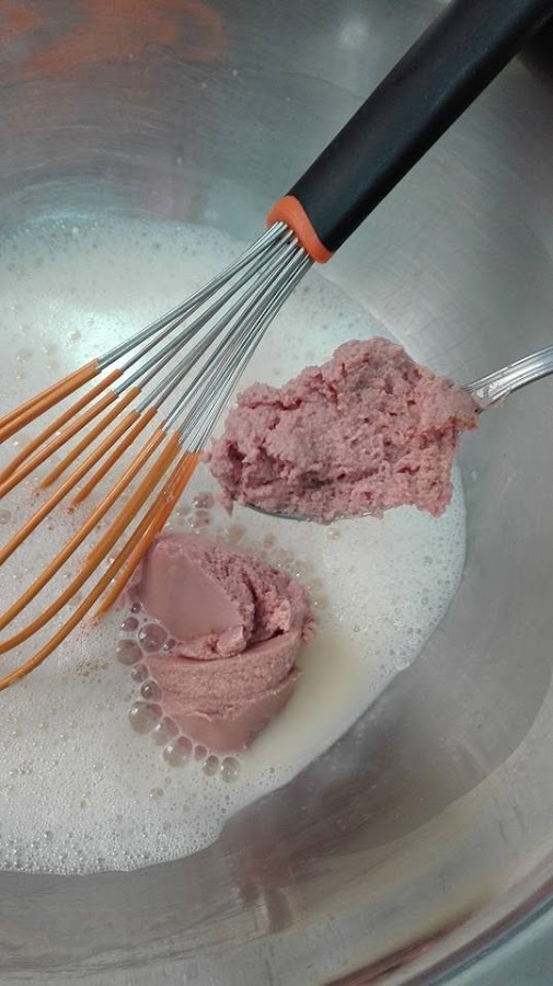Batimos los dos huevos. Añadimos la leche y el paté y batimos de nuevo.