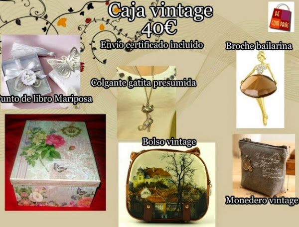 Y la segunda caja es la caja Vintage que contiene un bolso que es una maravilla , un monedero de estilo vintage, un colgante de una gatita con adornos de strass, un punto de libro muy bonito en forma de mariposa y nuestro querido broche bailarina, que es el centro de todas las miradas. Todo presentado en una preciosa caja y por tan solo 40€ con los gastos de envío certificado incluido.