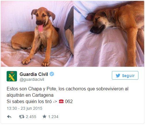 Amparo Martín, la voluntaria y presidenta de la Asociación Protectora de Perros Abandonados El Portalico, se ha convertido en el ángel de la guarda de los dos cachorros desde que, junto a otras compañeras, tuvo que limpiarles todo el alquitrán con lavavajillas y aceite de girasol. Asegura que Chapa y Pote están prácticamente recuperados físicamente y mucho mejor psicológicamente, pero… "Están muy tristes porque no encuentran un adoptante", subraya. Y eso a pesar de su aparición a principios de julio en el programa El Hormiguero, de Antena 3.