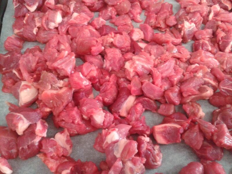 Cortamos en pedacitos muy pequeños toda la carne. Cubrimos la bandeja del horno con papel vegetal y colocamos la carne ya cortada en la bandeja del horno (no importa si los trocitos de carne no están separados).