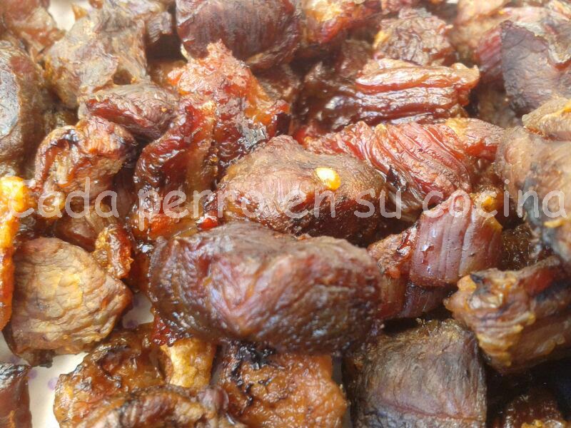 Cuando se haya deshidratado la carne (en nuestro horno fueron una hora y media, pero eso depende de la potencia del horno) se saca la bandeja.