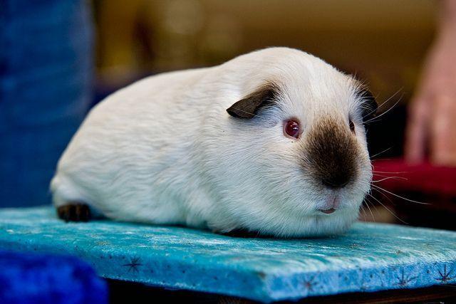 Cobaya Himalaya. El color del pelaje de esta cobaya es blanco o beige con las puntas de las patas y el hocico negro. Esta característica se la ha dado la evolución para ayudarlas a mantener el calor corporal en los climas fríos, si la cobaya es criada en climas templados o cálidos, no adquieren las manchas negras.