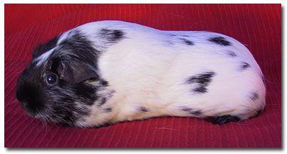 Cobaya dálmata. Es una cobaya bicolor, siendo la mayoría de las veces, esos 2 colores negro y blanco. En la zona del cuerpo el fondo es blanco y se forma un jaspeado con las manchas negras. La cara suele ser parte negra y parte blanca. También hay cobayas dálmatas grises y marrones.