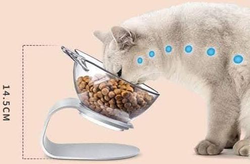 Para evitar el estrés de los bigotes, lo mejor es elegir cuencos más planos y anchos, de esa manera ,los bigotes no rozaran, con el cuenco.Hay cuencos elevados con una inclinación de 15 ,estos cuencos, son mucho más adecuados para evitar problemas de estrés, gases, y vómitos, estos comederos permiten que el gato coma de una postura casi sentada ,esto es especialmente importante si el gato sufre alguna discapacidad o artritis, ya que una postura como esta no representa tensión importante en los huesos o músculos del gato.