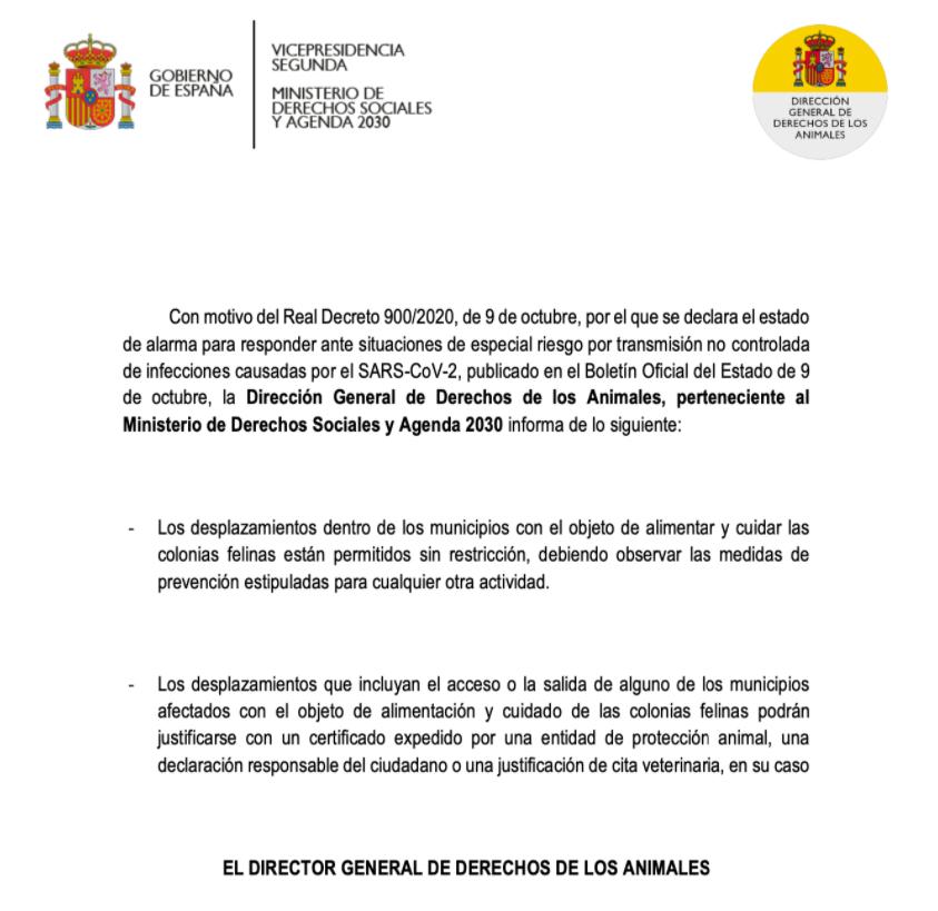 “Los desplazamientos que incluyan el acceso o la salida de algunos de los municipios afectados con el objeto de alimentar y cuidar colonias felinas podrán justificarse con un certificado expedido por una entidad de protección animal y una declaración responsable del ciudadano o una justificación veterinaria en su caso”.