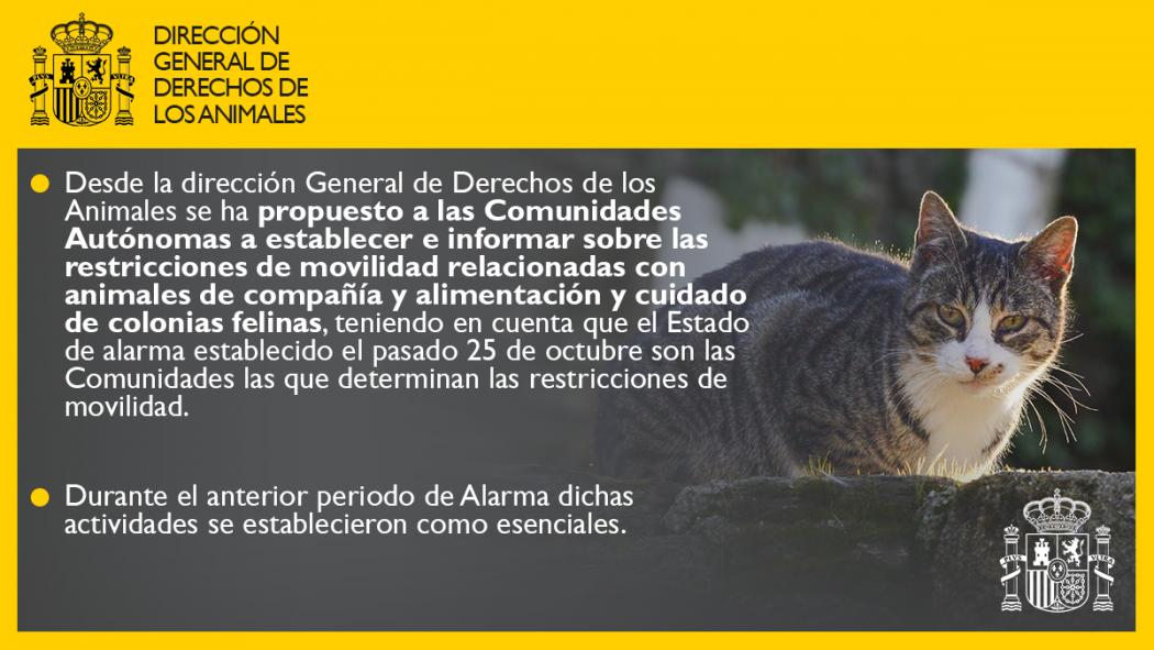 Con motivo del Real Decreto 900/2020 de 9 de octubre antecesor de este en la Comunidad de Madrid, la Dirección General de los derechos de los Animales perteneciente al Ministerio de Derechos Sociales y Agenda 2030 informaba de que:“Los desplazamientos dentro de los municipios con objeto de alimentar y cuidar las colonias felinas estaban permitidos sin restricción, debiendo observar las medidas de prevención estipuladas para cualquier otra actividad.
