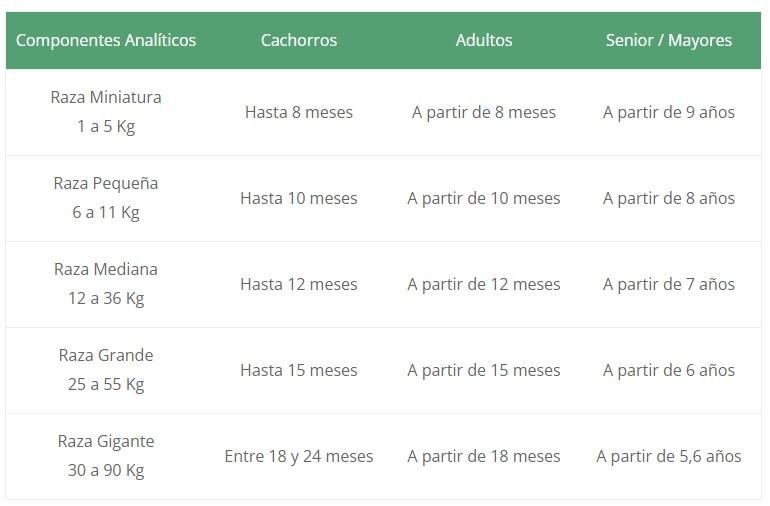 Esta tabla muestra una idea muy general de cómo es el desarrollo de los perros según su tamaño, aunque depende de cada raza, esta idea nos ayudará a explicar cómo debemos alimentar a nuestro perro a lo largo de su vida.