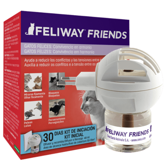 No pierdas la esperanza ni tires la toalla. La ciencia avanza a pasos agigantados y actualmente tienes una opción sencilla a tu alcance. Es posible que reine la armonía en tu hogar si utilizas un difusor de Feliway Friends. Se trata de un pequeño dispositivo eléctrico que libera hormonas de apaciguamiento felino, logrando reducir (está demostrado clínicamente) los conflictos entre los gatos.El uso no puede ser más sencillo. Tan solo tienes que enchufar el difusor (24 horas, los siete días de la semana) en aquellas estancias de descanso donde los gatos destinan más tiempo a dormir o a estar tumbados. No sitúes el dispositivo debajo de muebles o cerca de ventanas, puertas o aparatos de aire acondicionado porque las corrientes de aire arrastran las feromonas, haciendo que se consuma antes tu recambio.