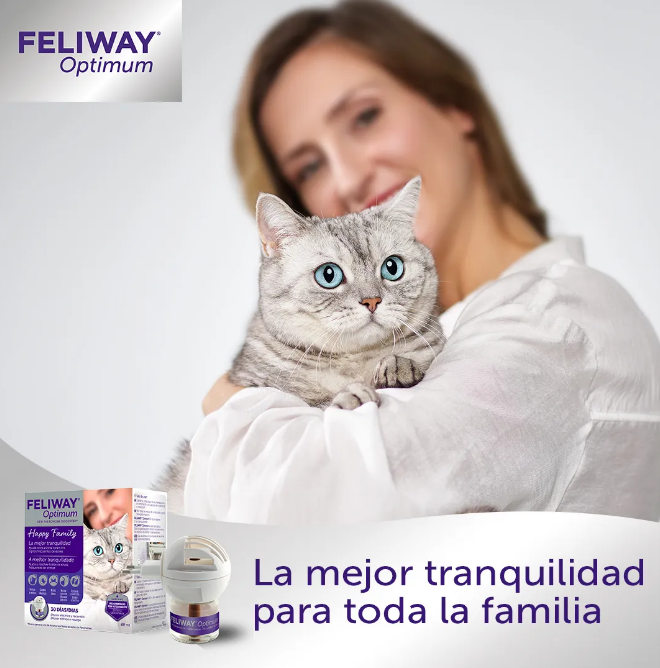 > Feromonas: se recomienda tener en casa un difusor de feromonas FELIWAY Optimum, que enviará mensajes de tranquilidad a tu gato facilitando su adaptación al nuevo hogar. Las feromonas son mensajes naturales que los gatos utilizan para comunicarse, las liberan en su territorio cuando se sienten cómodos y seguros. Feliway Optimum es una nueva generación de feromonas que ayuda a los gatos a sentirse tranquilos en más situaciones de estrés, mejorando también la relación con todos los miembros del hogar.