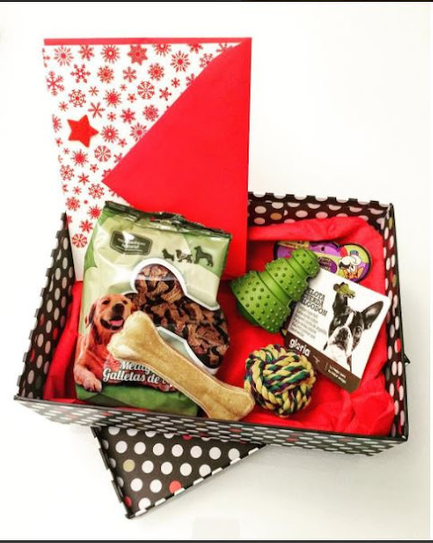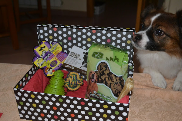El regalo contenía, además de una tarjeta preciosa para los 3 jeje, una pelota de cuerda (¡acierto total!), un juguete tipo KONG pero que parece un árbol de Navidad, un hueso de piel y una bolsa de galletas de carne de...¡Mediterranean Natural!