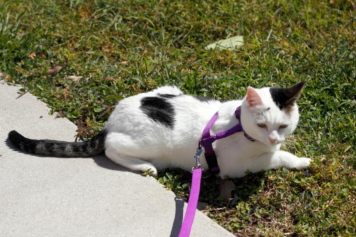 DESACONSEJAMOS completamente sacar a pasear al gato con arnés por los parques y calles, nos parece un acto totalmente irresponsable y peligroso.