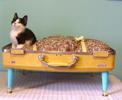 Para realizar una camas para gatos de esta forma, necesitaremos una maleta vieja a la que le quitaremos la tapa, atornillaremos cuatro patas (podemos pintarlas con aerosol) y por último la rellenamos con un bonito almohadón y voilá tenemos una cama reciclada.