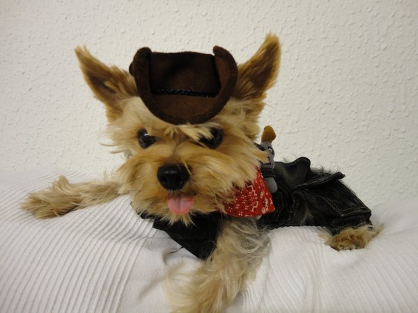Mi perrito es cariñoso y dulce, se llama "PATUFET", le gusta mucho irvestido, tiene de todo hasta smoking para ir a ceremonias.Si os fijais vereis que lleva hasta pistola. El sombrero de vaquero se lo he hecho yo, pues no lo encontraba por ninguna tienda.En el barrio todo el mundo lo conoce por lo sociable que es con otros perros y por el vestuario que lleva.No le gusta el pienso (ninguno), y el v ...