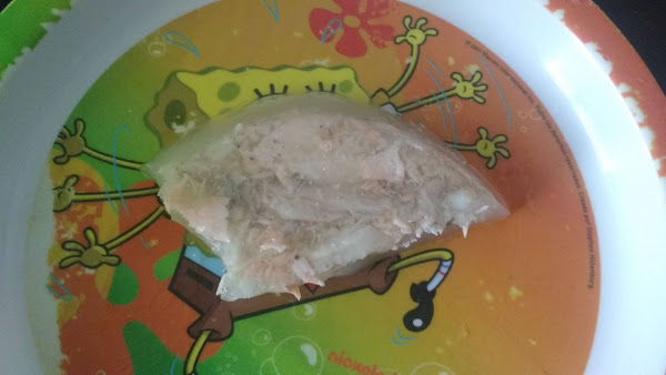 Pongo esa carne en el fondo de un molde o recipiente y con el caldo(sin sal, ni ajo o cebolla, solo pescado o verduras como zanahoria, guisantes o judia verde) hago gelatina. Yo uso láminas de gelatina que hidrato previamente pero vale cualquier gelatina neutra. Una vez hecha la vertemos en el molde y dejamos enfriar.
