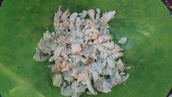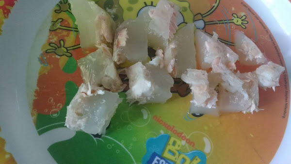 Cuando enfría lo cuelo y con cuidado saco toda la carne de los muslos o de la cabeza de salmón(salmón o atún como mucho dos días a la semana) y del pescado utilizado.