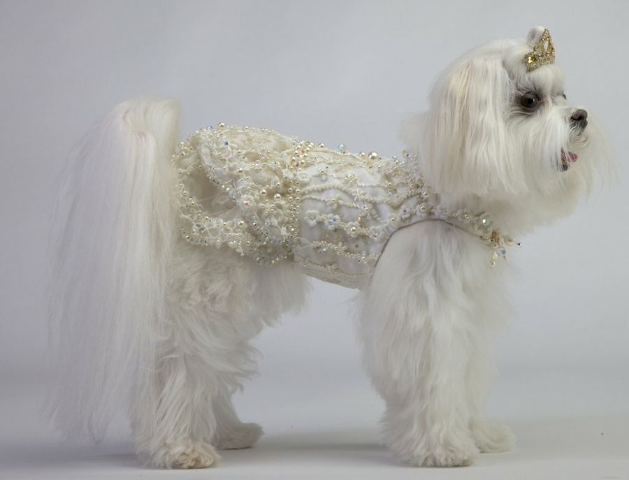 Ya que es un día especial, haz que lo sea también para tu perro. Si al final te decides a tenerle como invitado, tendrás que darle un buen baño y hacerle algo que le diferencie del resto de días. Un ejemplo puede ser ponerle un trajecito o un vestido, ya que el vestuario de los invitados es uno de los aspectos más importantes de una boda. Por eso, en Poppy?s Corner Shop tienen una amplia gama de vestidos y trajes para que los perros también vayan bien elegantes a las ceremonias: el chaqué Ruff Tuxedo para él, o el vestido Crystal Cream Lace Gown para ella. Si quieres que también ella vista de novia, hay vestidos que incluyen hasta el velo.Complementos para todos