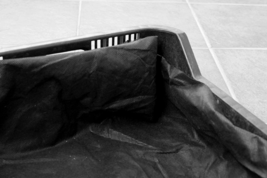 Los materiales para construir una cama para gato son un cajón de fruta, aquí tenéis muchas opciones, y sin duda la más bonita es la de madera pero pensé que con la humedad de la tierra igual me aguantaría menos tiempo el cajón. Un trozo de tela antihierbas, substrato y semillas de césped.