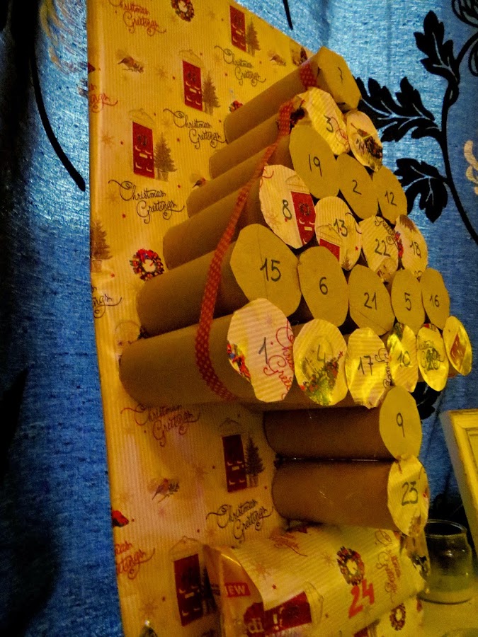 Es un calendario muy sencillo, pero que lleva un par de horas hacerlo. Así que es perfecto para esos días que está lloviendo o hace mucho frío y nos apetece quedarnos en casa con la chimenea, los que tengáis (yo en España tenía chimenea, pero aquí no....), con el árbol de navidad, una manta y una taza de té.