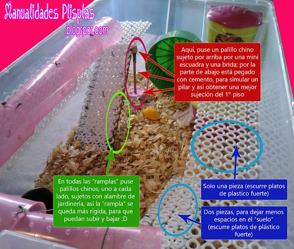 Para el suelo solo con las bridas se sujeta bastante bien, pero hay puntos muertos que necesitan de ayuda para no caer, así que eso lo solucioné con un mini pilar hecho con palillos chinos que lo explico en el recuadro rojo. Viéndolo se entiende mejor.