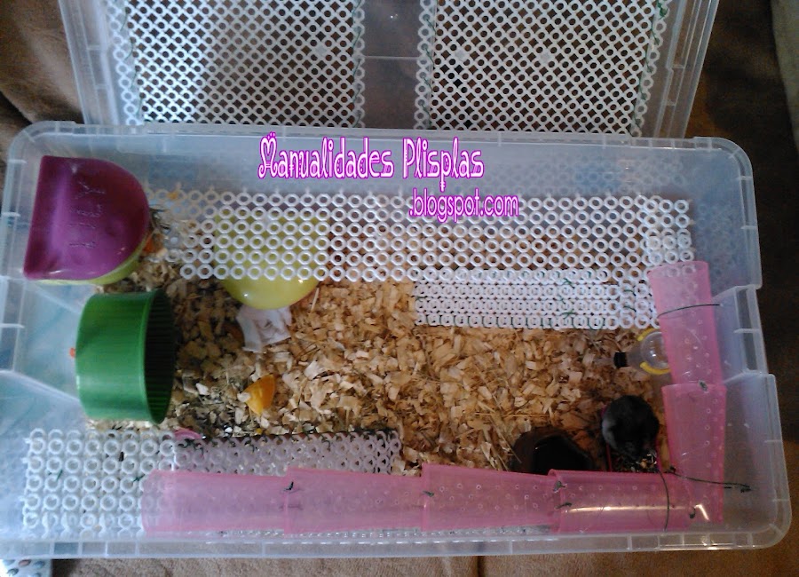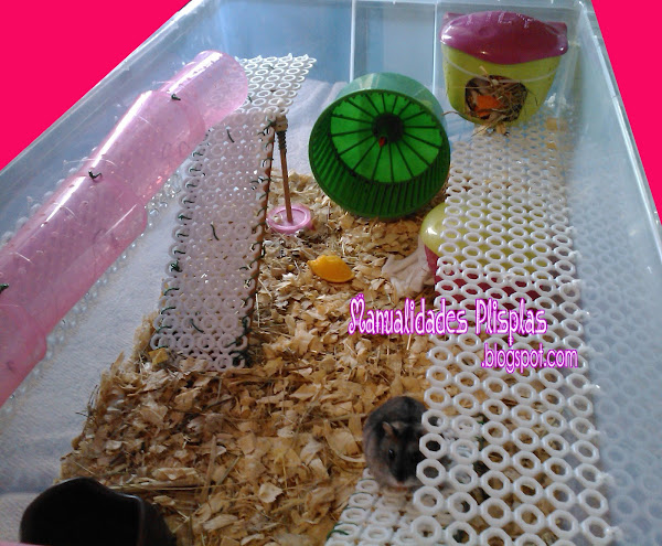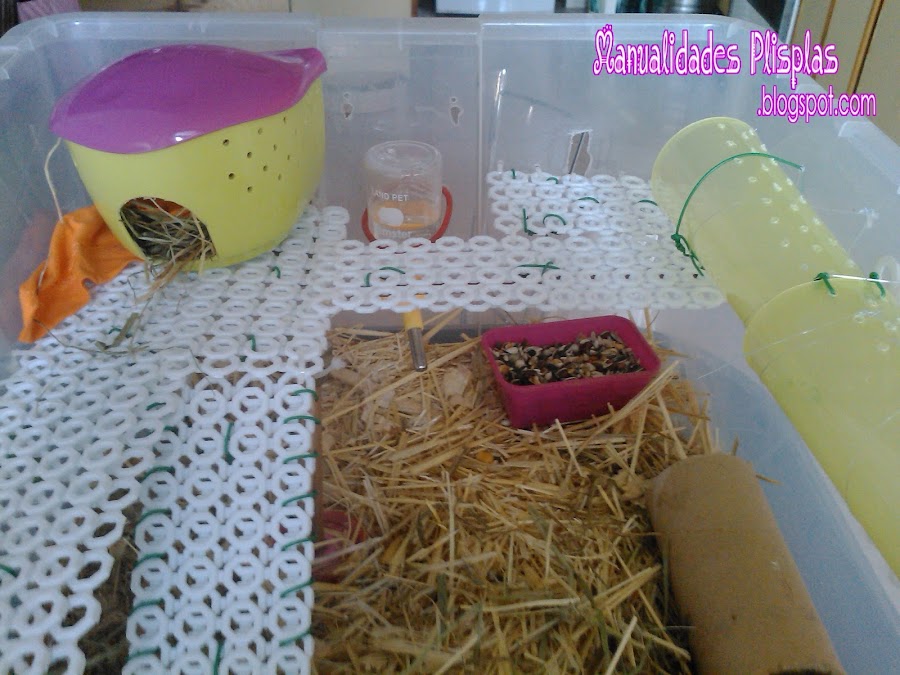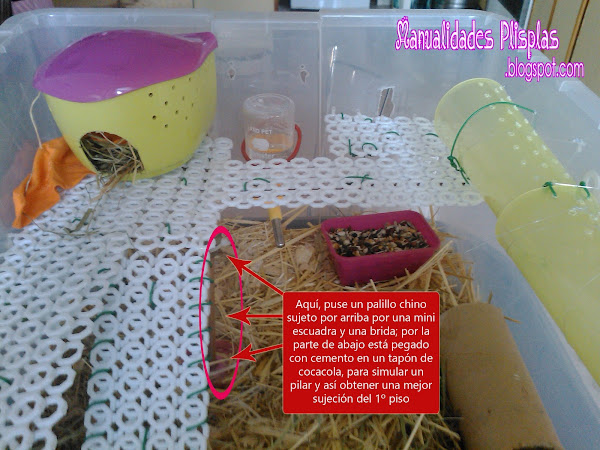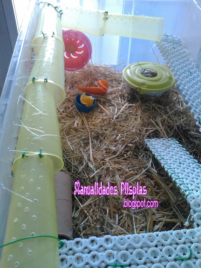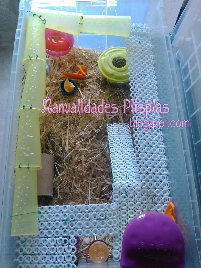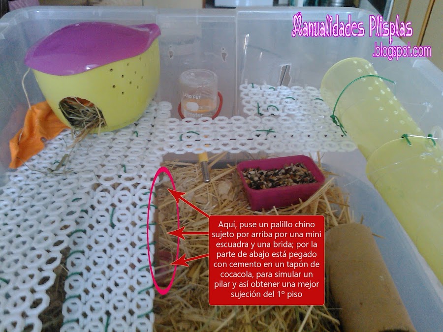 En un principio acople los túneles a la jaula con hilo de pescar, pero para limpiarlo era muy incomodo así que al final acabe quitando el hilo y poniendo el cable de electricidad formando como una especie de C en 3 punto que aguantaran el correteo de los hámster para no caerse.