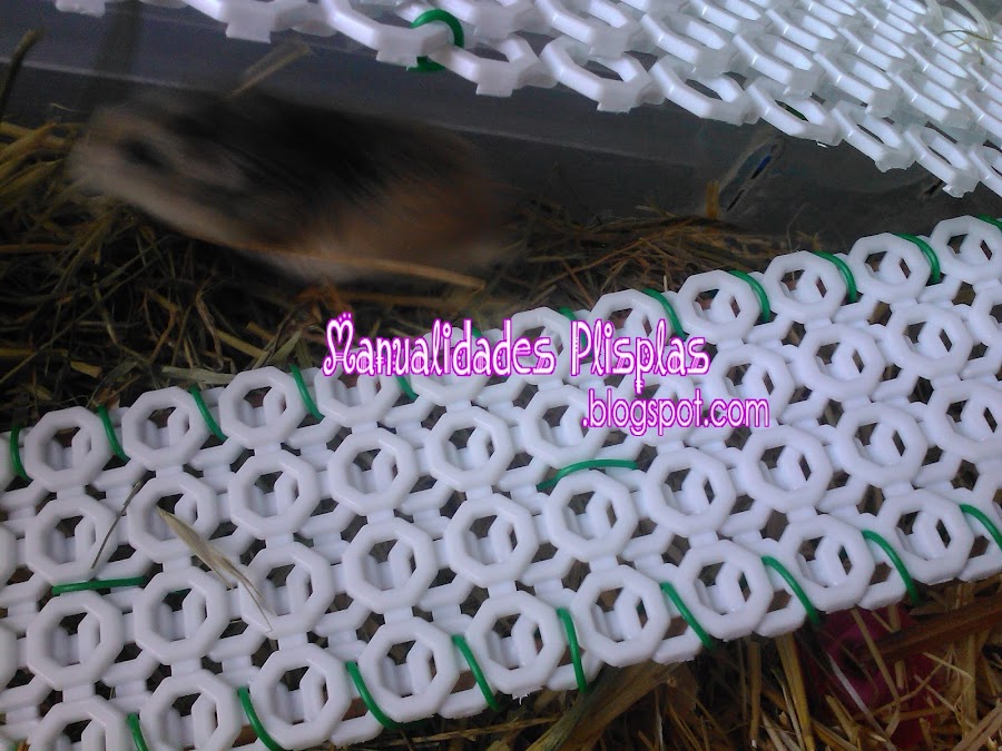 Cortamos los escurreplatos del ancho que mas nos guste y recomiendo, para mejor seguridad de nuestras mascotas ponerlo doble para que los agujero queden lo más pequeño posible para evitar accidentes con las patitas, os lo explico mejor en la foto en los recuadros azules, los escurreplatos los sujete uno con otro con alambre y con bridas.