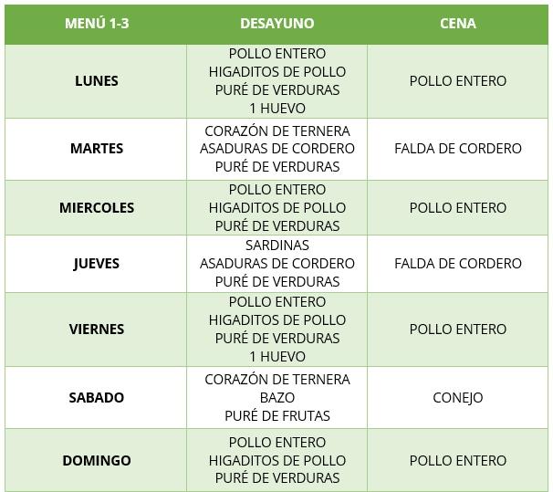 Pues ya tenemos la cantidad que debe comer cada perro al día y de que alimento, ahora queda establecer un menú mensual para que lo veas más claro.