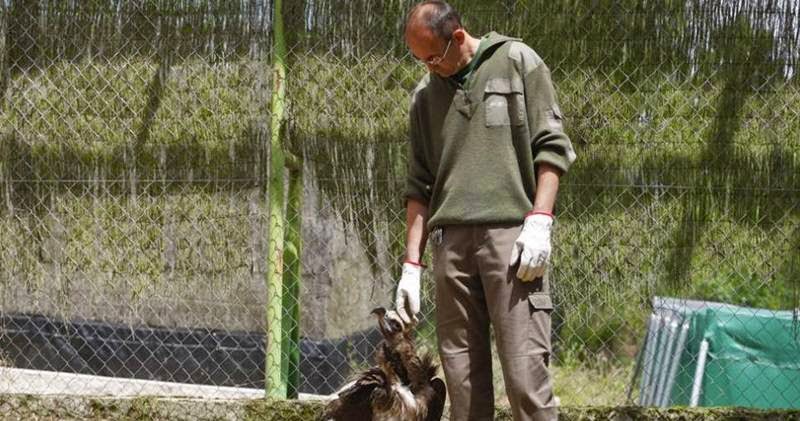 Un técnico del CREA de Los Villares atiende a un buitre negro.