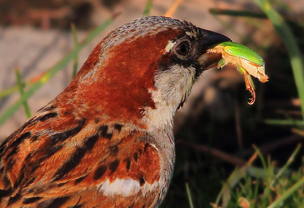 El gorrión es un pájaro de color marron clarito en las hembras a un marrón rojizo en los machos, suelen pesar unos 25 gramos y medir sobre 15 cm de longitud, los gorriones son unas aves muy unidas al ser humano, siempre habitan en zonas donde residen personas, ya que las necesitan para vivir, pues gran parte de su alimentación es de la comida que aprovechan de nosotros, por eso es muy común verlos anidar en huecos o lejas de las casas.