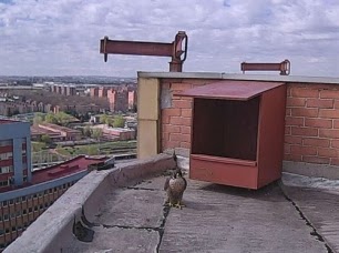 Uno de los halcones delante del nido que le han instalado en la azotea del hospital.El Hospital 12 de Octubre de Madrid, en colaboración con la Asociación Española de Cetrería y Conservación de Aves Rapaces (AECCA) y el Grupo de Rehabilitación de la Fauna Autóctona y su Hábitat (GREFA), ha instalado una caja-nido para una pareja de halcones peregrinos en la azotea del edificio de hospitalización de adultos, situada en la planta 18, según ha informado el hospital en un comunicado.