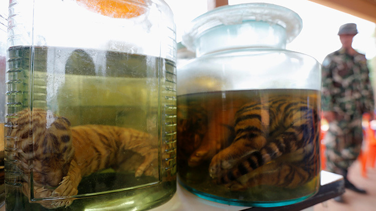 Cachorros de tigre conservados dentro de jarros encontrados en un laboratorio