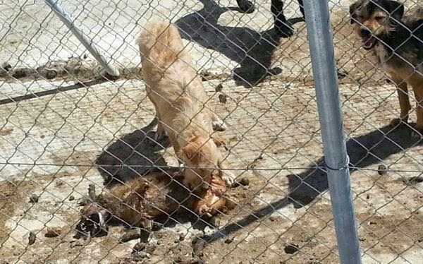 En una de las jaulas, el cadáver de uno de los perros permanece en el suelo.
