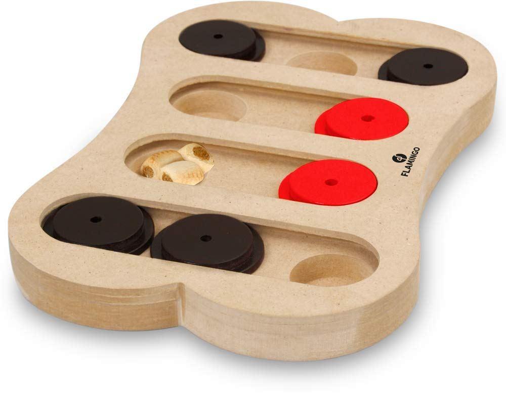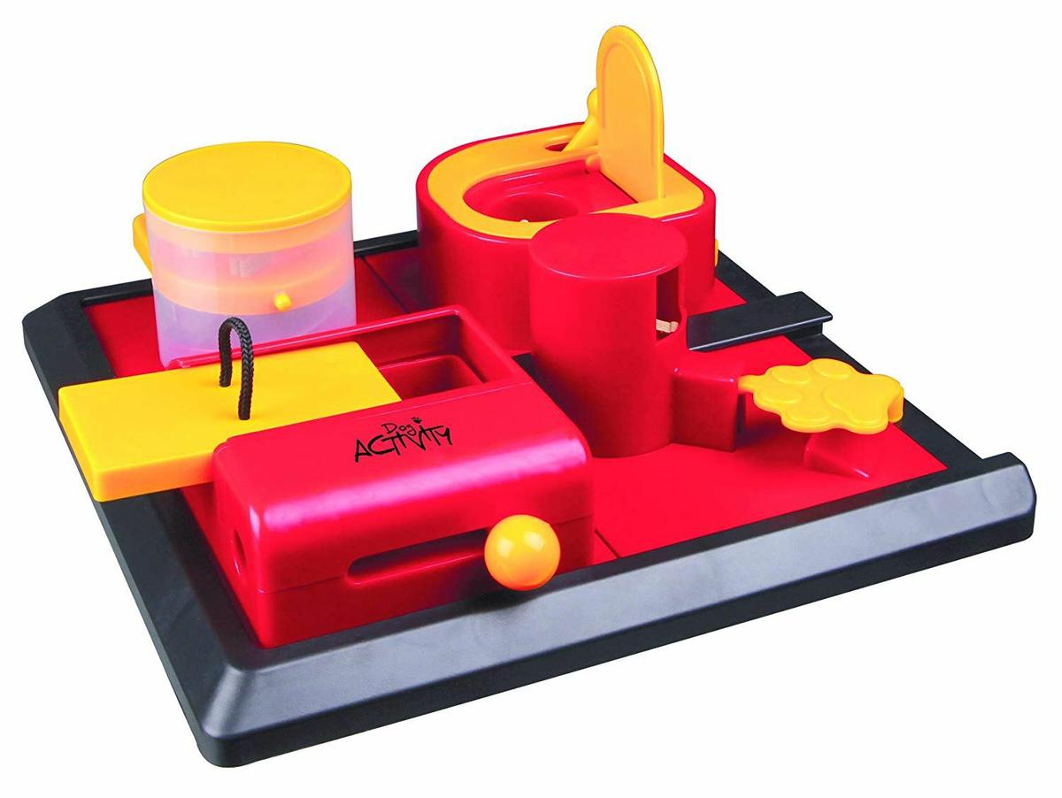 Este juego tiene varias partes en la que nuestro perro tendrá que conseguir el premio de distintas formas: levantando tapas, tirando de la cuerda, presionando… Es una muy buena opción ya que podremos empezar poco a poco con cada una de ellas y luego hacer todas a la vez.
