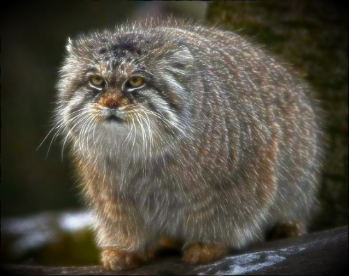 Su pelaje es abundante y grueso, sus pupilas son redondas, patas cortas y orejas separadas y pequeñas.