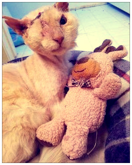 Tras el ataque, el gato estuvo varios días vagabundeando, muy adolorido, hasta que una mujer lo encontró en su auto e inmediatamente lo llevó al veterinario, donde le suministraron antibióticos y le realizaron estudios. Dado su estado, el especialista sugirió sacrificar al felino, pero la mujer se negó y decidió llevarlo a un santuario de animales, llamado Milo, especializado en cuidar gatos ancianos, maltratados, con discapacidades o enfermos, en donde se contactaron con otro veterinario.