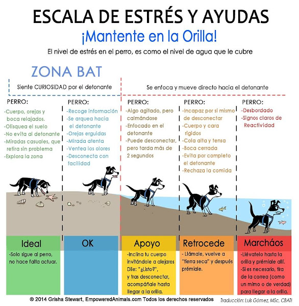 La idea es trabajar en zona segura para no llegar a zona conflictiva, sin reacciones exageradas y aprendiendo a gestionar situaciones. Si aprende que ladrando espanta a aquello que le da miedo, estamos trabajando en una zona poco recomendable y debemos revisar el trabajo.