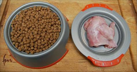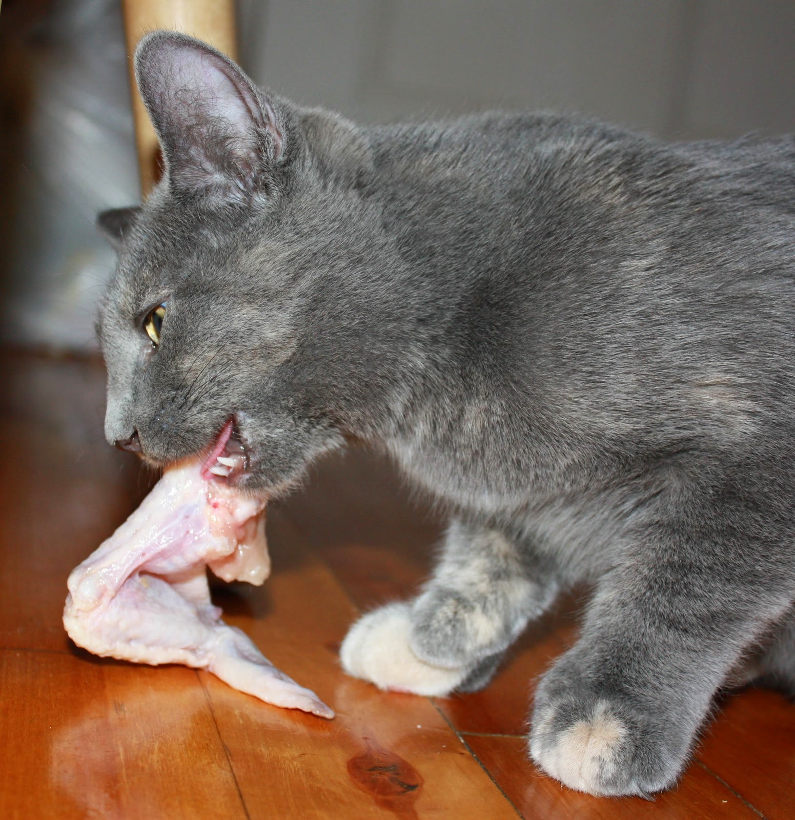 Normalmente la gente elige dar de comer otros animales a su gato, por ser más fácil de encontrar en un supermercado normal y ser menos "gore". Si damos trozos de animales (tales como cuellos de pollo, patas de pavo, conejo...etc) hay que seguir unas proporciones básicas: