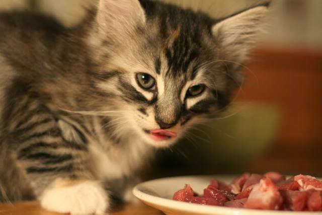 - No mezcles la carne cruda con pienso. El pienso seco ralentiza el paso de la carne cruda y baja la acidez del aparato digestivo, aumentando las posibilidades de proliferación bacteriana. Da de comer a tu gato la carne cruda cuando tenga el estomago vacío o "casi vacio" (hace unas horas que no come). Espera unas tres horas antes de volver a ponerle pienso en el cuenco.