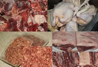 No hace falta darle estos procentajes "en cada comida" sino que se pueden ir dando a lo largo del dia o de la semana. Lo más importante en este tipo de dietas es la variedad: no siempre dar el mismo tipo de carne. Podemos elegir entre pollo, pavo, codorniz, conejo, ternera, cerdo, caballo, avestruz, canguro, cordero, cabra... y todo lo que se nos ocurra. Los animales pequeños, con trozos de carne que tienen huesos y cartílagos masticables, son ideales para los gatos.