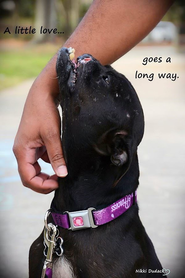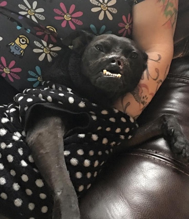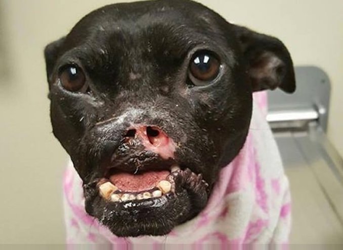 En agosto de 2015, Stephanie y su esposo Mike, quienes tienen un grupo de rescate llamado Passion 4 Pits, encontraron a esta perrita en un refugio de Florida, cuando le faltaba la mitad del rostro y su cuerpo estaba lleno de huesos rotos, señales de un maltrato terrible.
