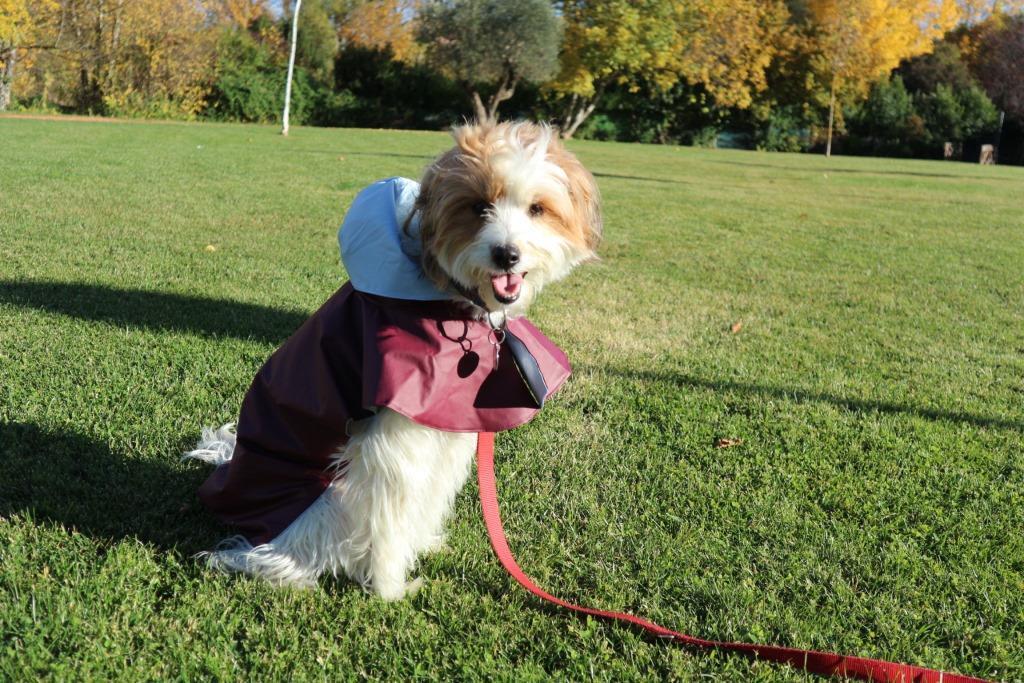 En el caso de Lucca sin embargo, hemos optado por abrigarla desde joven debido a su predisposición a acatarrarse: día que bajan las temperaturas y damos un paseo largo o que pasea empapada… al día siguiente acabábamos en el veterinario. Optamos por sudaderas elásticas cuando las temperaturas son bajas que le permiten moverse sin problema y se lavan fácilmente (algo importante ya que cuando las utilizamos es cuando vamos a estar bastante tiempo a la intemperie y siempre acaban rebozadas en barro) y una capa impermeable cómoda para cuando llueve mucho (cuando son cuatro gotas salimos sin nada y luego pasamos por toalla y secador al llegar a casa).