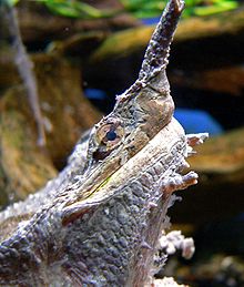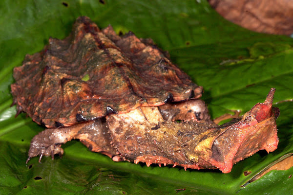 Su caparazón en forma de corteza de madera y su cabeza son ideales para camuflarse en aguas donde hay vegetación caída de los árboles, ya que parecen parte de ese ecosistema.