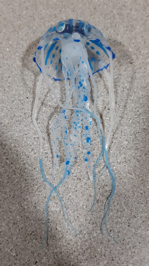 Llenamos el tanque de agua, lo encendimos y lo dejamos más de 30 segundos antes de introducir las medusas de silicona. Le echamos 2 o 3 gotas de detergente de lavavajillas tal como indicaban las instrucciones y metimos las medusas del revés y las sacudimos con una pajita para eliminar las burbujas de aire que se forman en ellas. Pues las medusas empezaron a mover sus tentáculos impulsadas por el aire que proviene del motor pero inmediatamente después se fueron hacia la zona superior donde se quedaron por mucho tiempo. Así que las volvimos a sacudir con la pajita pero nada de nada, conseguimos que bajasen un momento pero al ratito ya estaban de nuevo flotando en la superficie. Os enseño una foto para que veáis lo que os digo.