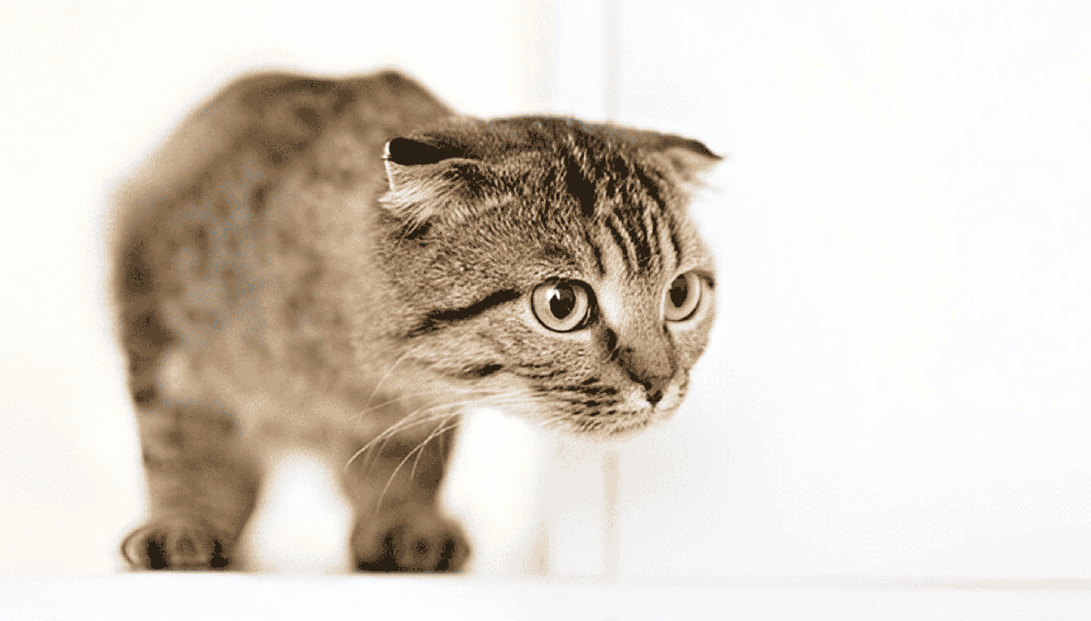 Posición agachada con cola escondida: Señal de miedo o sumisión. El gato intenta disminuir su presencia y proteger su abdomen.
